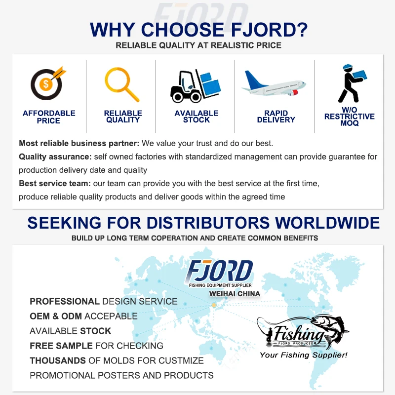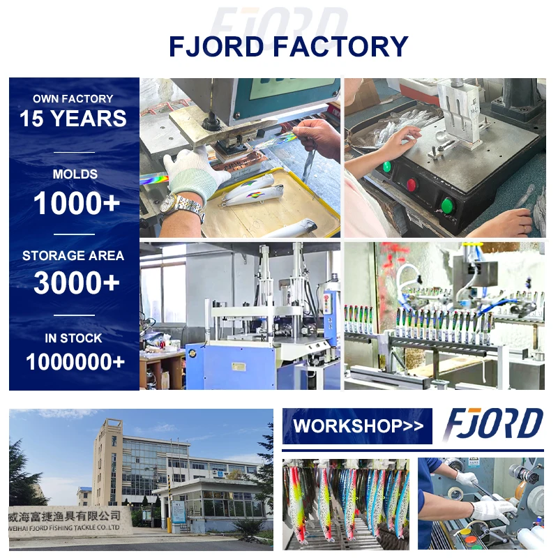 威海FJORD渔具有限公司位于中国渔具制造行业的中心——山东省威海市。 凭借超过20年的专业经验,我们专注于生产高品质的渔具路亚,并提供一站式采购服务,涵盖鱼竿、鱼轮、鱼线以及各种渔具配件,满足您对全套渔具的需求。 我们的工厂结合了现代化的设备、严格的质量控制和专业的研发团队,以确保卓越的产品性能和可靠的交货。 我们提供全面的 OEM 和 ODM 服务,将您的概念和设计转化为市场就绪的产品。 我们自豪地在全球范围内推广我们自己的品牌 FJORD。 专为咸水爱好者设计,FJORD 鱼饵和鱼竿有现货,可在 7 天内发货。 我们欢迎经销商和分销商加入我们不断发展的全球网络。 我们致力于帮助合作伙伴取得成功并在其市场中保持强劲竞争力,这得益于持续创新、卓越价值和以客户为中心的支持。 如果您正在寻找可靠的渔具供应商或品牌合作伙伴,我们专业的销售团队随时准备为您提供帮助。 我们期待与您建立持久的合作。